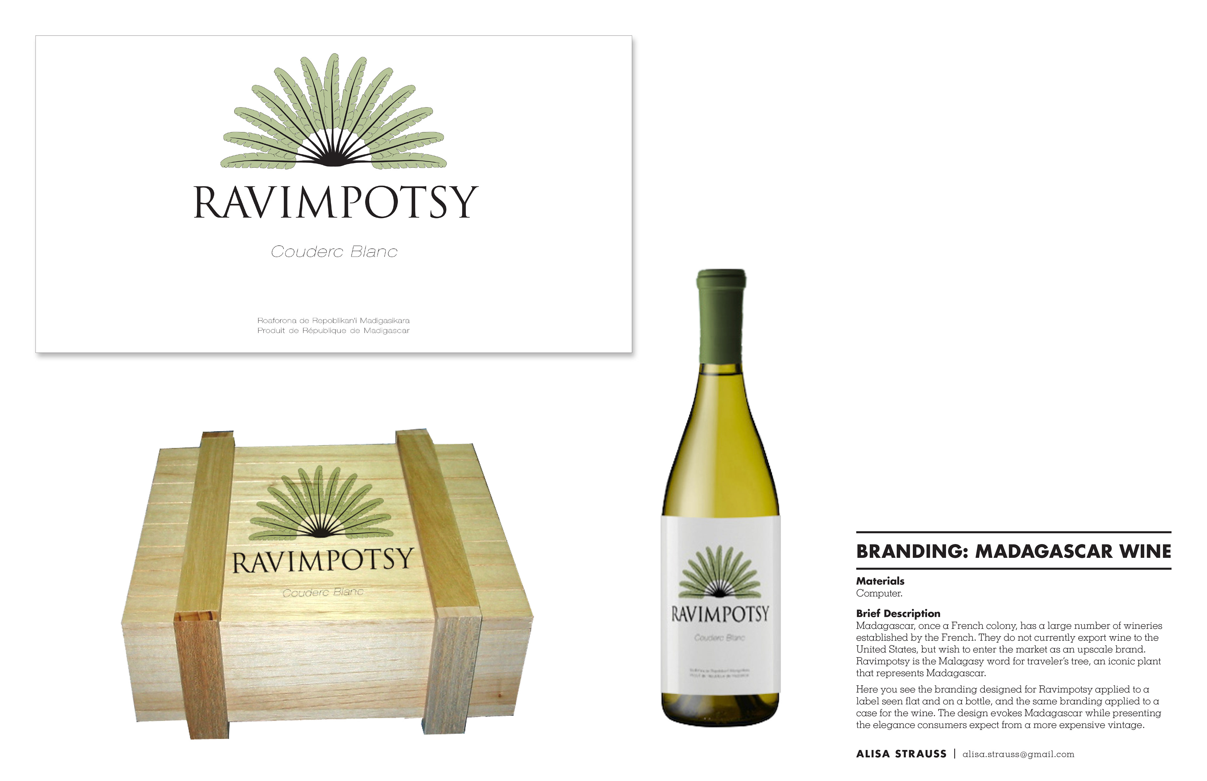 Branding designed for Ravimpotsy (Malagasy for "travelers tree"), a new Madagascar wine wishing to enter the market as an upscale brand.